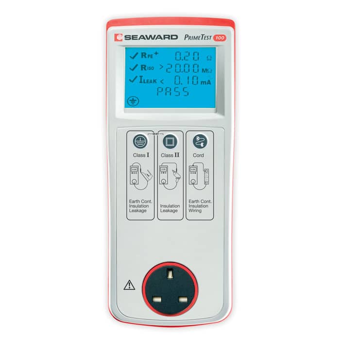 The PrimeTest 100 portable appliance tester is battery powered and handheld to allow for fast and efficient testing with clear PASS/FAIL indication and test result values. A simple range of tests are selected at the push of a button to test earthed equipment, double insulated equipment or mains cords and leads.